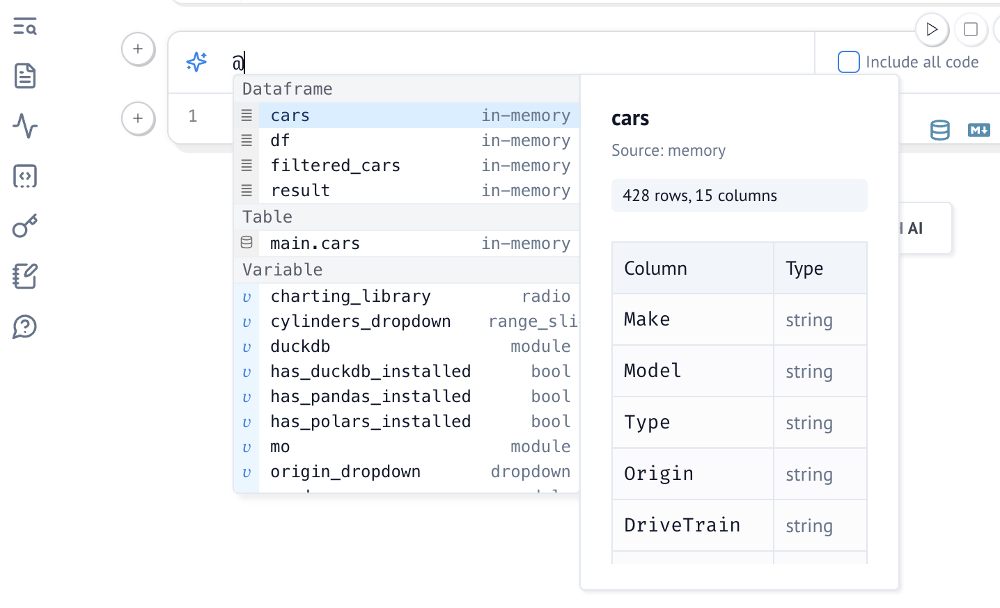 marimo's AI assistant has your notebook code as context. You can additionally